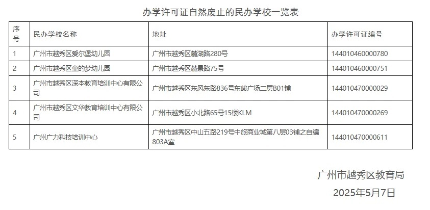 根据《中华人民共和国民办教育促进法》和《中华人民共和国民办教育促进法实施条例》有关规定,越秀区爱尔堡幼儿园、童的梦幼儿园、深本教育培训中心有限公司、文华教育培训中心有限公司、广力科技培训中心,5所民办学校的《中华人民共和国民办学校办学许可证》已自然废止。